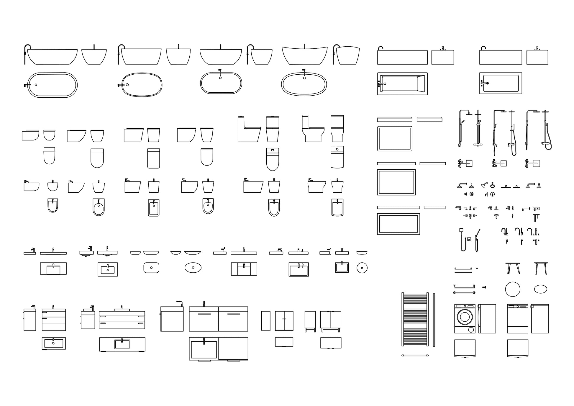 All the furniture blocks in this pack are individually hand-drawn and perfect to be used in precise architectural drawings. This file contains 50+ modern Bathroom blocks in plan and elevation.